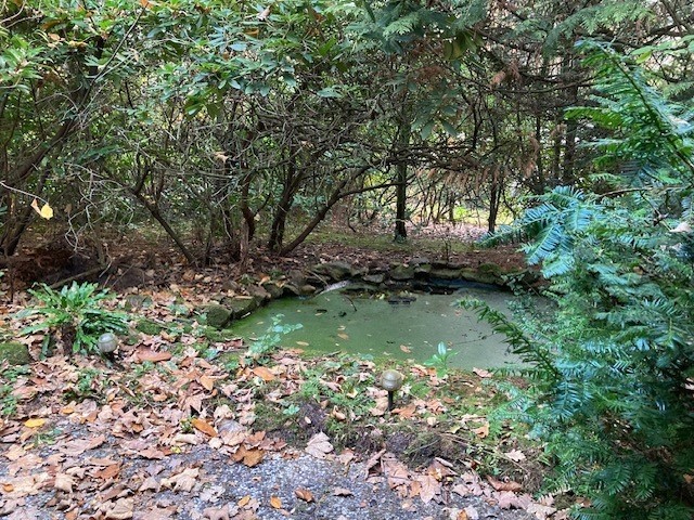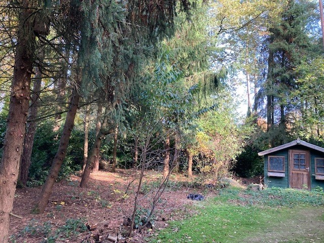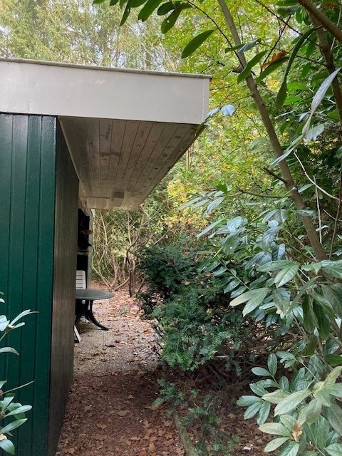 De bungalow staat op 1.021 m2 eigen grond. De riante tuin heeft meerdere terrassen; vanaf een van de terrassen kijkt u uit op een vijver, waar diverse vogels komen badderen. Door de aanwezigheid van groenblijvende hagen, gazon en bomen ervaart u het bos optimaal met diverse eekhoorns, egels en vogels en beschikt u over veel privacy. De tuin biedt voldoende zon en schaduw op elk moment van de dag. In de tuin staat een vrijstaande berging. Ook is er een eigen (afsluitbare) oprit voor vier auto’s.